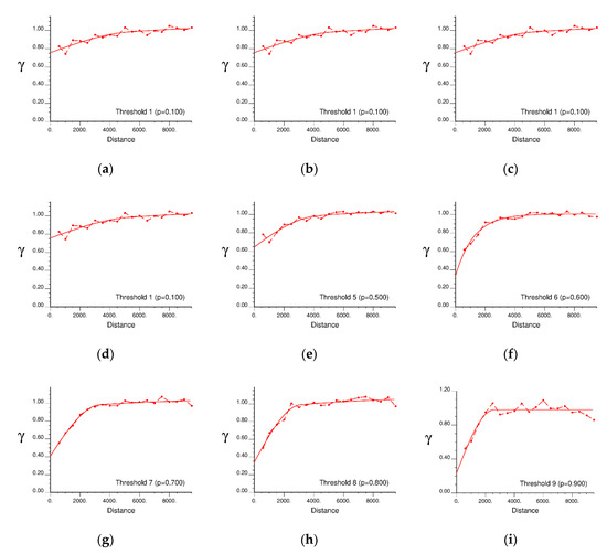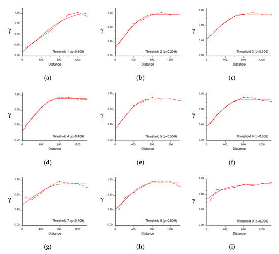 Experimental (dot) and theoretical (line) variograms calculated for thresholds (a) one to (i) nine of the Seoul borehole dataset.