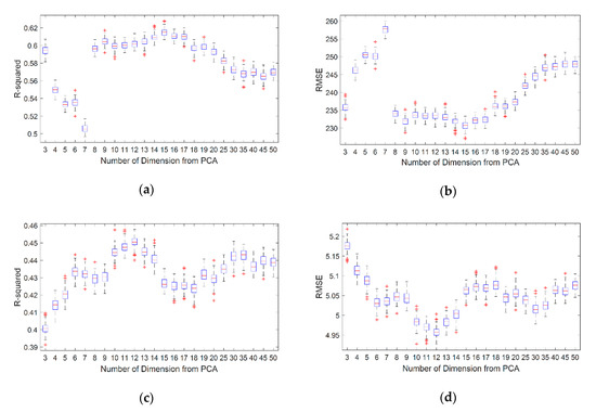 Before comparing the performance of each method, the process of selecting the optimal number of PCs was conducted by evaluating the prediction performance according to the number of PCs. Each performance was evaluated through five-fold cross-validation. R-squared and RMSE were used as performance criteria. Figure 7 shows the results of evaluating the R-squared and RMSE according to the number of PCs in the Meuse and Seoul datasets. As the results predicted from each tree are random in the RF, the prediction can be different even though the algorithm consists of five hundred trees. Therefore, a hundred RFs were performed according to the number of PCs, and each performance was shown in a box-plot. As a result, the best performance was obtained when the number of PCs was fifteen and twelve for the Meuse and Seoul borehole datasets, respectively. Finally, the performance of the proposed method, using the optimal number of PCs, was compared with the performance of other methods.