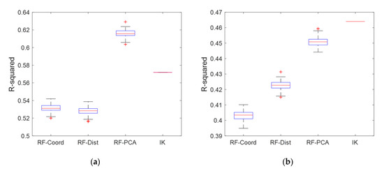 The prediction performances of each method are specified in Table 3. Figure 8 shows a box-plot comparing the R-squared values of each method. For the RF spatial predictions, the performances are shown as a box-plot because different performances were calculated according to one hundred iterations. On the contrary, for the IK, a line in the box-plot is shown because the same result is obtained regardless of the number of iterations. Overall, when comparing the spatial prediction results of each method for both datasets, the range of target values (i.e., the difference between the maximum and minimum values) predicted by the IK was narrower than the range of true data, and the standard deviation was low. The reason for this is that IK applies ordinary Kriging for each indicator; therefore, the target values of the regions within each indicator are predicted to approximate the average of the individual thresholds.