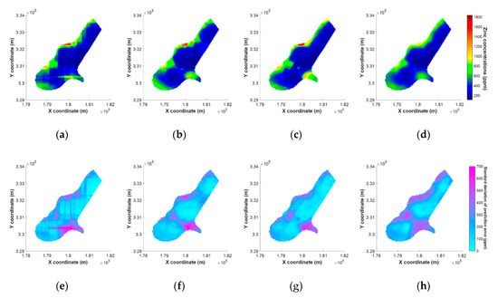 Comparison of predictions based on each methodology for the Meuse dataset: predicted zinc concentrations ((a) random forest with coordinate input (RF-Coord); (b) RF with distance input (RF-Dist); (c) RF with principal component analysis (RF-PCA); (d) indicator kriging (IK)) and standard deviation of prediction error ((e) RF-Coord; (f) RF-Dist; (g) RF-PCA; (h) IK).