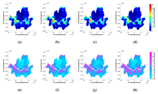 Comparison of predictions based on each methodology for Seoul dataset: predicted deposit soil thickness ((a) RF-Coord; (b) RF-Dist; (c) RF-PCA; (d) IK) and standard deviation of prediction error ((e) RF-Coord; (f) RF-Dist; (g) RF-PCA; (h) IK).