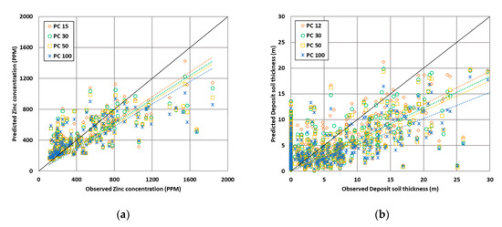 On the contrary, as the number of PCs used in the RF excessively increases, the accuracy of spatial prediction decreases, and therefore the target values were underestimated. Figure 12 shows the prediction results in a scatter plot after five-fold cross-validation for both datasets according to the number of PCs. As the number of PCs increased, the slope of the trend line with zero intercept decreased. Through this, it was assumed that the RF was underestimated. In addition, the underestimated prediction trend was confirmed by the gradual decrease of the average and maximum values of the predicted results, as described in Table 4.