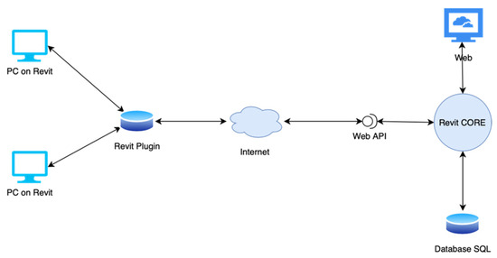 The BIMLegacy project is an online platform aiming at unifying and synchronising heritage architecture information. The contributions of the platform propose a work platform where interdisciplinary stakeholders can synchronise heritage information. The platform has been developed under the design science research methodological approach. This method of development relies on a prototype definition which is enriched and corrected in several iterations. The result is an online heritage platform defined as a common data environment (CDE) that allows synchronising information in real-time. The system architecture is presented in Figure 1. The architecture presented shows that access to the data is done through a platform supported by the Revit application. An API allows access to the data via the Revit Plugin. Figure 1 clearly shows the dependence on the Revit environment and the need to adapt to the data formats of the software.