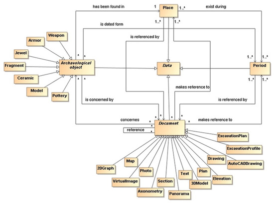 The HIS proposed in [47] (Web for CH) was one of the first to include the dimension of multi-users and multi-application within a shared computing environment. Moreover, once implemented, the information is accessible via the web and therefore, accessible to an entire community through a virtual research environment dedicated to the exploitation of intra-site data. The architecture of the project remains simple. The information is accessed through a web server queried via PHP language and information stored on a MySQL database. The significant input of this research is the proposed data model that relates together the place with the document that describes the archaeological object. This information model is efficient to manage heterogeneous sources from the archaeological environment (see Figure 2). The semantic data model shows a classical approach linking archaeological objects with various documentary sources. The model is built around a generic class “Data”. This class is specialised in the model’s constituent elements, namely the management of location, time, documentation and archaeological objects (tangible elements). This modelling choice, which could be questioned, gathers all the information in a single class. Explicit time management is proposed in the model. However, it is limited to a periodic representation which can lead to incoherence when representing some heritage sources. The system does not allow several interpretations of the same sources as proposed by [49]. Finally, at that time, the primary way to implement such information model was the relational database environment. Despite the usefulness of this approach, the heritage information is too heterogeneous for a replication of the implementation. The NoSQL approaches are now recommended for such applications [50].