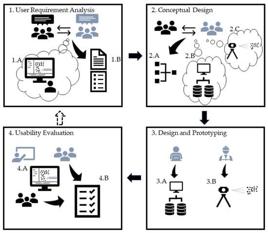 The four steps of the user-centred approach and their main deliverables: 1.A—user stories, 1.B—specifications, 2.A—conceptual data model, 2.B—IS interfaces and architecture mock-up, 2.C.—data acquisition methodology, 3.A—IS implementation, 3.B—data acquisition, 4.A—training sessions, 4.B—usability report. Black human icons refer to users, and grey human icons refer to developers.