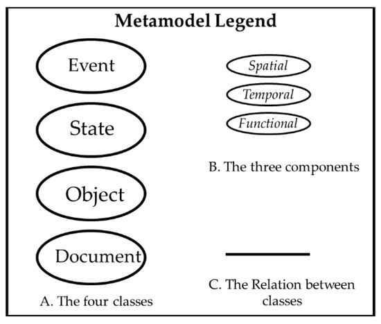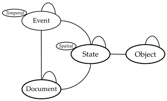 The core concepts are four classes (object, state, event and document), three components (spatial, temporal and functional) and the relation between classes (see Figure 7). Each of these four classes can be in relation with another class or with itself and might have spatial, temporal or functional components, which is in line with the well-known Peuquet’s triad [57]. An object is a class referring to the core elements targeted through the modelling process (e.g., a wall). A state is a stable combination in time of several characteristics related to an object (e.g., the state of a wall composed of stones during a given period and at a given elevation and shape). A state does not exist without a clear relation to one object (e.g., a set of stones and mortars combined during a certain period at a particular location is considered as corresponding as a state of a given wall). An event leads to a change of properties which triggers the creation of a new state (e.g., the destruction of part of a wall during a fire leads to the apparition of a new state of the wall with a different size). A document is a source of information which can be linked to an event or a state (e.g., a written report mentions the occurrence of a fire at a given place at a given moment in time). Depending on the applications, an element could be either associated to an object or a document (e.g., a written report can be a document in an archaeological site context, but it could be an object in a library description context).
