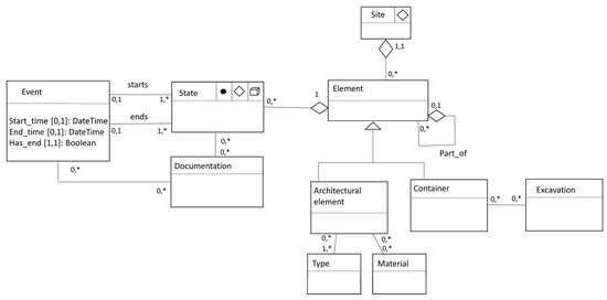 The adopted version of the metamodel for the Coudenberg project is presented in Figure 8. In particular, only the event class has a temporal component, and only the state class has a spatial component (with a minor exception for one object—“Site”; see Figure 9).