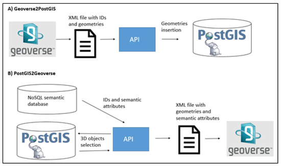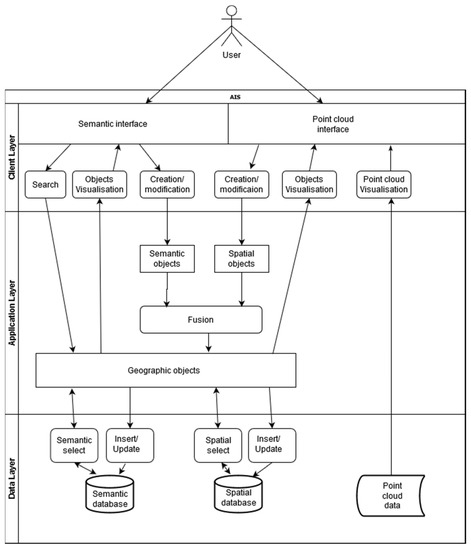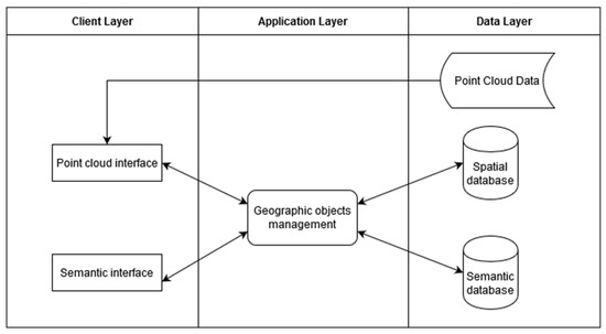 Once again, a distinction is proposed in the data layer to easily take advantages of different database management systems (DBMS). Indeed, some tools can be efficient for spatial data (spatial database) while others can be more adapted to heterogeneous information (semantic database) or huge point clouds (point cloud data). These three data components can be separated or possibly grouped into one DBMS if such a tool meets all the users’ requirements. No matter which DBMS is used, it is up to the application layer to query the different DBMS and eventually merge results to rebuild geographic objects.