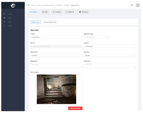 In the current version of HIS-PC, a user can extract “manually” 3D geometric information from the 3D points cloud and link it to an object in the database. We wish to integrate automatic 3D segmentation and classification functionalities to help users populate and enrich the system. These functionalities are currently under derivation from the research works [70,71,72,73], based on device, analytic and domain knowledge. It requires, in particular, a heritage object domain ontology obtained from standardisation works (e.g., CIDOC-CRM [74]) and in line with the conceptual data model of the HIS-PC.