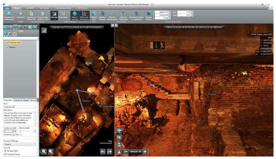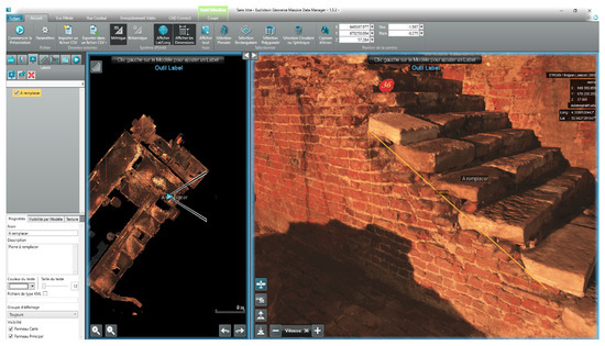 Since the last couple of years, the research community has focused on the ability to interpret surveys as parametric shapes or features to fit the BIM standard modelling approach. Most of the proposed works focused on point cloud data as they now represent the mainstream of captured information on the heritage site, whatever information is collected via TLS or photogrammetric processes. The so-called Scan-to-BIM aims at improving the feature recognition and reduce the treatment time to interpret, structure and create BIM objects from a point cloud [29,30,31,32]. It has to be said that for most of the cultural heritage application, those approaches are not feasible due to the time that is required to generate a complete, accurate and controlled model of heritage sites. Moreover, the interpretation of heritage objects is performed in a certain context that depends on the experience of the operator performing the recognition (or who control the automated feature recognition). As mentioned before, the management of a cultural heritage site requires the collaboration of many specialists. Each of the specialties has to interpret the reality regarding the requirement of their field. It means, for example, that a built archaeologist and an architect will not segment a building in the same way. Therefore, the information structuration is greatly complexified to manage all viewpoints [33]. Some projects tried to face this problem [34,35,36,37,38], the most efficient application rely on data structure managing temporal information [39] or not that are not directly related to BIM information structure but on ontologies [40], relational databases [41,42] or NoSQL data structures [43].