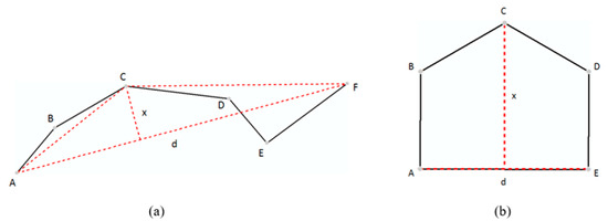 Prior studies (e.g., [5,42]) have proposed the mentioned three measures based on the DP algorithm. As Figure 2a shows, x is the distance of the furthest point C from the segment linking two ends of a polyline (AF); d is the length of segment AF; and area equals the area of triangle ACF (x*d/2). In this study, we computed those three measures for VW, BS, and HD methods too, according to their own types of areal simplifying units. Taking the HD method as an example, as we know that the polygon will be decomposed into a set of convex hulls, the three measures can then be defined as Figure 2b illustrates: x is the furthest point C from the longest edge of a convex hull (AE); d is the length of longest edge AE; and area is the area of the convex hull ABCDE.