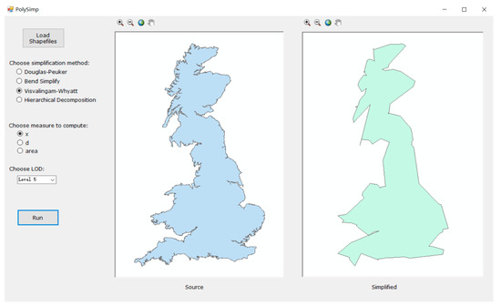 There are currently few tools with which to readily conduct the polygon simplification using four algorithms from the fractal perspective. To address this issue, we developed a software tool (referred to as PolySimp) in this study to facilitate the computation of introduced three measures and the implementation of generalization (Figure 4). The software tool was implemented with Microsoft Visual Studio 2010 with Tools for Universal Windows Apps. The generalization function was carried out by ArcEngine data types and interfaces of NET Framework 4.0. The software tool is designed to perform the following functions. The first is an input function. The tool should be capable of (a) loading a polygonal data and (b) presenting results to the inbuilt map viewer. The data files can be prepared in a format of Shapefile, which is the mostly widely used format in the current GIS environment. The second function is the output function, which is to generate the polygon simplification result based on the selected criteria; that is, the algorithm, the type of measure, and the level of detail to be generalized. When the generalization is completed, the result is shown in the second panel on the right-hand side. This software tool can be found in the Supplementary Materials.
