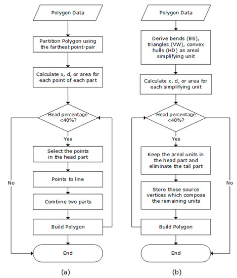 Flow chart for conducting polygon simplification based on head/tail breaks for each algorithm.