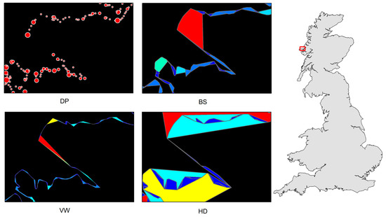 (Color online) Basic geometric units of a part of the British coastline (referring to the red box in the right panel) for each polygon simplification algorithm derived by PolySimp. (Note: Panels on the left show a clear scaling hierarchy of far more small ones than large ones, represented by either dot size or patch color).