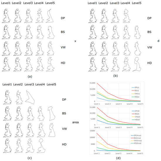 (Color online) The simplified results of the British coastline at different levels of details through four algorithms in terms of the polygonal shape based on x (a), d (b), and area (c); and the corresponding number of points (d) respectively.