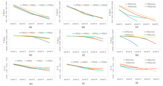 For a more in-depth investigation, we computed the area (S), the perimeter (P), and the shape factor (P/S) for each simplified result. Figure 8 shows how they change respectively regarding each algorithm with different parameters. With three types of computed metrics (S, P, and P/S), we could measure and compare the performance of different simplification methods guided by the underlying scaling hierarchy. Ideally, the curve of each metric would be flat at each level of detail, meaning that the simplified polygon shapes are maintained to the maximum extent of the original one. In other words, a steep curve could indicate an unpleasant distortion (e.g., level 3 of the DP method in Figure 7c and Figure 8c). In general, we could observe from Figure 8 that VW and HD methods could capture a more essential shape across different levels than DP and BS, irrespective of the metric type. It should be noted that the metric curve of BS appeared to be flatter than that of VW or HD in some cases (e.g., Figure 8i); however, the simplified result at each level using the BS method kept many more points (about 50%) than that using either VW or HD (Table 3). In this connection, BS was less efficient. On the opposite, the large slopes of the metric curves of DP may often be caused by the dramatic drop of points. Therefore, we conjectured that the results of VW and HD algorithms achieved a good balance between the number of characteristic points and the core shape of the polygon, leading to a better performance in this study.