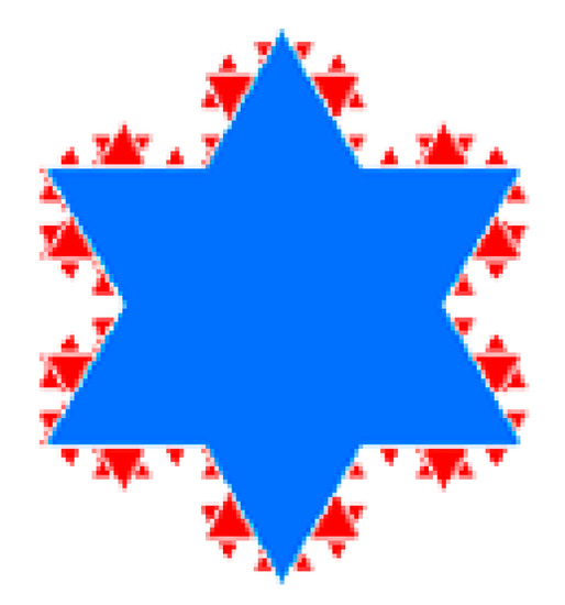 (Color online) The simplification process of the Koch snowflake guided by head/tail breaks. (Note: The blue polygons in each panel denote the head parts, whereas the red triangles represent the tail part, which needed to be eliminated progressively for generalization purpose).