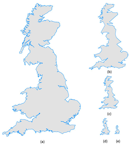 Using the proposed approach, the simplified results can automatically serve as a multiscale representation because each level of detail can be retained in a smaller scale map recursively. Consider the example of the British coastline that is generalized using the HD method with x; we calculated the scaling ratio of this example using the exponent of x of all convex hulls of the original polygon data. The exponent value was 1.91 so the scaling ratio could be approximately set to 1/2. It should be noted that the idea originated from MapGen [44]. Figure 10 shows the resulting map series, from which we could see that the simplified result at each level fit well with the decrease of scale. In this connection, we further confirm that the fractal-geometric thinking leads us to an objective mapping or map generalization [24], wherein no preset value or threshold is given to control the generalization process. Namely, the generalization of a polygonal feature can be done through its inherent scaling hierarchy, and the scaling ratio of the map series, objectively obtained from the long-tailed distribution of geometric measures (e.g., the power law exponent), can be used to properly map the simplified results. Thus, we believe that the fractal nature of a geographic feature itself provides an effective reference and, more importantly, a new way of thinking and conducting map generalization.