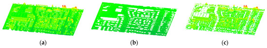 The example of the filtering result. (a) Raw point cloud; (b) Ground points; (c) Non-ground points after ground removal.