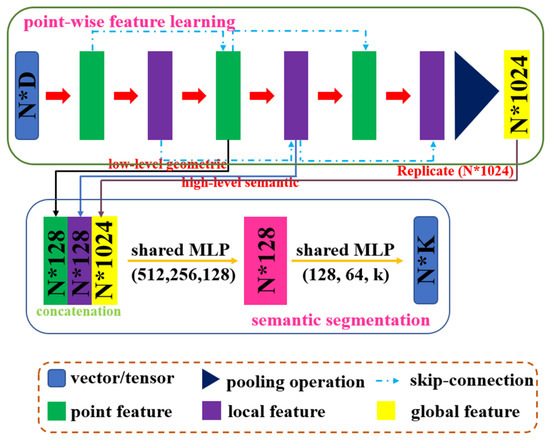 The point-wise semantic label is determined based on the prediction score vector after minimizing the loss function. Finally, the semantic segmentation maps the initial point cloud features to new high-level feature spaces. Namely, points of the same semantic category are clustered together, while the different classes are separated in the semantic feature space.