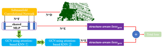 To automatically extract each tree crown points, a novel end-to-end architecture is applied to individual tree segmentation, which combines structure-aware loss function and attention-based k nearest neighbor (KNN). The proposed framework is summarized in Figure 6, we elaborate on the three main components of our proposed network, including the submanifold convolutional network, the structure-aware loss function and the graph convolutional network (GCN), respectively. We firstly generate initial embeddings for each point by the submanifold sparse convolutional network. Inspired by the work of [62], we obtain discriminative embeddings for each tree from the LiDAR points based on the structure-aware loss function, which considers both the geometric and the embedding information. In order to achieve refined embeddings, we develop an attention-based graph convolutional neural network that aims to automatically choose and aggregate information from neighbors. Finally, to get segmentation of individual roadside trees, we employ a simple improved normalized cut segmentation algorithm to cluster refined embeddings.