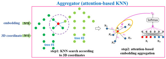 where the input embeddings of point clouds are denoted by X = , are the k nearest neighbors of according to their spatial positions, and is the attention weight for each neighbor and the normalization of the softmax function.