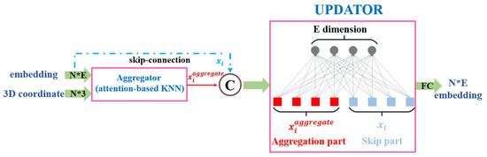 In the previous research, the GCN is normally composed of two parts: the aggregator and the updator (illustrated in Figure 8). As explained above, the aggregator is to gather information from neighbors using the proposed attention-based KNN. To update the aggregated information by mapping embeddings into a new feature space, a simple fully connected layer without bias is used as the updator. The operation is formalized as follows: