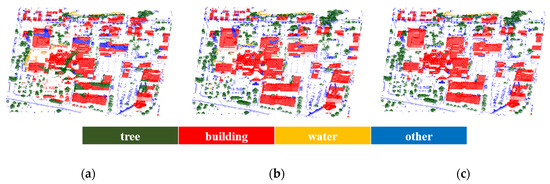 Although accurate minimization is intractable, the minimization problem is easily and appropriately solved by a graph-cut algorithm using the -expansion [57,58]. With a few graph-cut iterations, we can effectively and quickly find an approximate solution for optimizing multi-label energies. The labeling cost is not considered since graph-based optimization can effectively leverage the prediction and confidence, as well as semantic label assignment between two similar points in each region. The optimized results could be automatically adaptive to the underlying urban scenes without the predefined features for some uncertain objects.