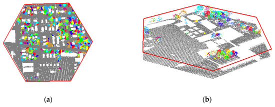 In existing filtering algorithms, the morphological filtering algorithm [47] obtains non-ground points while retaining the terrain details; the progressive densification method [48] has gained popularity owing to its robustness and effectiveness in segmenting ground points, however, it has inadequacies when dealing with topographically and environmentally complex regions and tends to remove ground points on steep regions and flatten the terrain. To obtain better filtering performance for complex urban areas, we investigate the feasibility of improving progressive TIN densification filtering of point clouds. Compared with previous work [49,50], the enhancements of the proposed IPTD filtering algorithm encompasses three aspects. (1) Potential ground seed points are obtained through extended local minimum for the grids containing points and the nearest neighbor was adopted to interpolate the elevations of grids without points instead of using the lowest points in user-defined grids. (2) Accurate ground seed points are acquired by judging the elevation difference in the neighborhood of the local thin plate spline interpolation by the given threshold. This operation provides more ground seed points that are generally evenly distributed. (3) Before upward densification, downward densification is performed to promote the ability of the proposed algorithm in coping with slope variations. Lastly, the ground points are extracted by iteratively densifying ground seed points, the remaining points are taken as non-ground points. Figure 2 shows an example of the point cloud before and after ground removal, where the colors represent elevation variations.