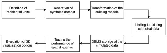 Our study combines reality-based and procedural building modelling. Namely, the simulation of the cadastral dataset is based on available data about existing buildings, acquired from the official records at the National Surveying and Mapping Authority, combined with the simulated data generated by procedural modelling, where randomised 3D building models are constructed based on the predefined rules. The developed approach aims to satisfy the following requirements: (i) the process of generation of the synthetic dataset is guided by the existing cadastral data from the current cadastral database; (ii) the 3D building models in the dataset should be randomised; and (iii) the dataset should be stored in a spatial DBMS, where data storage, access, maintenance, and manipulations can be performed and evaluated. Using the existing cadastral data for the study area, we have tried to obtain more representative placement and configuration of the simulated buildings, where we focus on residential buildings. Figure 1 summarises the framework of our study. The process starts by defining the type of residential units. This information is then used for generating the synthetic dataset using the procedural modelling method []. The generated models are then transformed to fit into a GIS environment to be suitable for data storage in the spatial DBMS. The procedurally generated 3D building models are then linked to real cadastral data on buildings by location and the number of storeys. In this study, spatial DBMS is created and run locally. Its structure is focused on the storage of the simulated 3D dataset in the form building models, including their interior spaces, i.e., rooms. Due to different legal frameworks, historical background and other factors, countries have various definitions of real property units as well as various implementations of cadastral databases. The stored simulated data are designed to allow linking data with additional country-specific data.