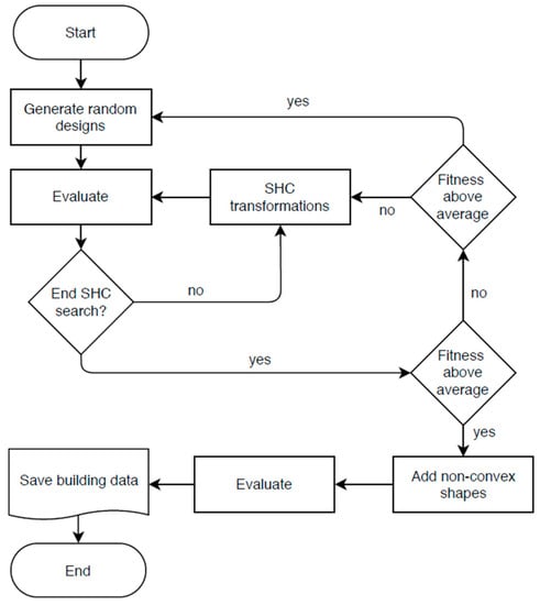 For this study, the Evolutionary Program for the Space Allocation Problem (EPSAP) algorithm was used []. The EPSAP algorithm consists of a two-stage approach that has an Evolution Strategy (ES) framework, where the mutation operation is replaced by a Stochastic Hill Climbing (SHC) method. Figure 2 depicts the overall generation process. The algorithm starts by creating a set of candidate designs that have their rooms randomly dispersed in the 2D space on each storey. Then, each design is evaluated according to a weighted-sum cost function of eighteen penalty functions that are minimised. At this moment, the second stage starts by iteratively changing each design with random geometric and topologic transformations, such as translation, rotation, stretching, reflection, and swapping. If the transformed design produces an improved solution, the new design is preserved. When the SHC stage is incapable of finding further improvements, the second stage ends and the first stage resumes by selecting solutions that have a fitness lower than the average fitness of all designs. The worst solutions are replaced by new randomised ones, which are also evaluated. This cycle is then repeated until ES stage reaches a maximum number of iterations or is unable to find more improved design solutions (for the complete description of the EPSAP algorithm see []). Lastly, the whole 3D building is produced by adding height to each storey (measured from the storey floor to the ceiling), extruding rooms for one or more storeys (e.g., a stair serves a range of storeys), positioning the openings in relation to the room floor (i.e., the distance from the floor to the base of the opening) vertically, and giving height to the opening (i.e., the void height in the wall). In the case when a storey multiplier is present, the storey is repeated.