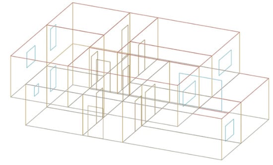 The building models comprise enclosed volumes with surfaces for walls, floors, ceilings, doors, and windows (see Figure 3). The adjacent rooms are in a touching relationship, having common interior walls, slabs, and door surfaces.