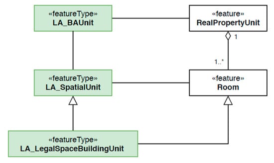 The data model of the simulated buildings can be linked to the LADM data model, as presented in Figure 4. The simulated models of buildings represent their physical components. It must be noted that the boundaries of real property units may not coincide with the physical features of a building []. However, in case of buildings, a strong link exists between physical and legal spaces, which has been studied by Aien et al. [], Li et al. [] and Knoth et al. []. These studies also include the links to the LADM standard data model that are similar to our study. In recent years, many studies investigated the potential of integrating building information models (BIM), which contains physical information on buildings, with 3D cadastre [,,]. In this study, the real property units are realised by the aggregation of rooms that belong to the corresponding real property units. Therefore, the investigation is limited to physically defined 3D boundaries.