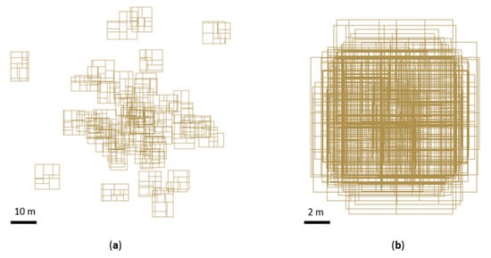 (a) Original placement of generated 3D building models; (b) the same models after their placement to the local coordinate system origin.