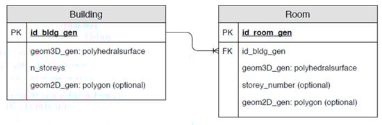 In the spatial DBMS, two tables are created, one for storage of generated 3D models of rooms and one for 3D models of buildings (Figure 8). These two tables are linked by the common building model identifier (id_bldg_gen). The 3D geometries of rooms are stored as polyhedral surfaces, together with the unique room identifier (id_room_gen), the identifier of the corresponding building and optionally the number of the storey in which the room is located (storey_number). For the buildings, the 3D geometry is also stored as a polyhedral surface. Alongside geometry, the attributes containing the unique identifier of the building and the number of storeys are inserted. Optionally, the 2D geometries of rooms and buildings can be stored for applications, where only 2D geometries are needed or supported.