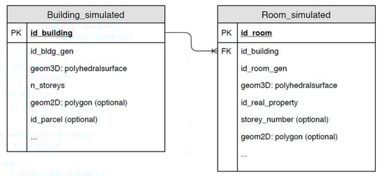 The referencing is performed using SQL queries as all the data (real cadastral data and generated building models) are stored in the DBMS. For the simulated cadastral dataset, we have created two tables, first for data on the building interior (room_simulated) and second for the building exterior (building_simulated) (Figure 9). The two tables are connected by the cadastral building identifier (id_building). Using the id_building, the available cadastral attributes can be added optionally, for instance, the identifier of the parcel to which the building is related. For each building, the corresponding data on building interior (room geometries) is inserted into the room_simulated table. There, the identifier of the real property is stored, which is used to aggregate the rooms into real property units. Optionally, the storey number where the room is located can be stored. Various options for DBMS storage of similar data are discussed in [].