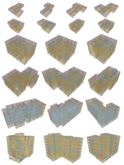 The buildings were generated in four runs, each for a building type, in a 2.8-GHz Dual-Core CPU with 8 GB of RAM. Multi-threading was used. In the generation of each building type, the duration of the processing time ranged from 49 min to 15 h, depending on the complexity of the building requirements. First, the number of storeys in the Slovenian building cadastre was investigated. The test showed that 94% of the residential buildings have four or fewer storeys. Based on this, we decided to use 1, 2, 4 and 8 storey building models for the case study. In total, nine algorithm runs were carried out, producing 282 building models. Figure 10 displays a few examples of the generated buildings (all generated buildings can be accessed from the link provided in the supplementary materials).