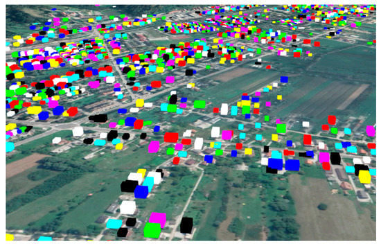 All the transformed building models are stored in the spatial DBMS in a local coordinate system. However, this is not close to the real case of 3D cadastral data. The generated building models need to be spatially referenced and randomised, as stated in the initial aims of this study. This part is based on the characteristics of Slovenian cadastral data on buildings—the Slovenian building cadastre. There, the buildings are stored in the form of a vector layer with building outline polygons and an attribute database. A common building identifier connects the two datasets. Models are georeferenced by two parameters to the real (Slovenian) data: (i) building location, defined in the national geodetic reference coordinate system D96/TM based on ETRS89; and (ii) the number of storeys. The building location is calculated from a centroid of a building polygon. Those centroids are considered as their reference centre in the local coordinate system origin.