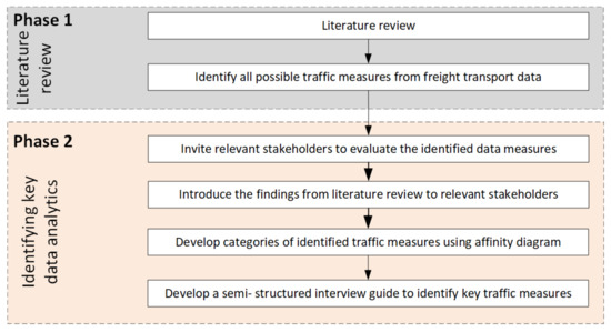 In this paper, we utilized a requirements-gathering approach that is based on an affinity diagram, following the approach in [21]. The proposed approach includes two main parts, as shown in Figure 2. The first step includes reviewing relevant literature to identify different ways of using freight data in transportation planning by public authorities. The second part aims to identify the users’ requirements through the use of an affinity diagram and semi-structured interviews with the relevant stakeholders.