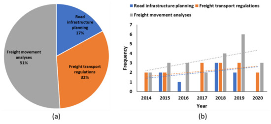 Distributions of the identified articles in categories of infrastructure-planning (a), freight movement regulations (b), and freight data analyses (c).