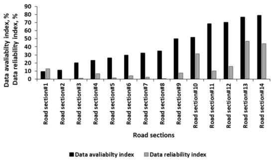 The process of calculating the minimum sample size and the two indices was conducted for 14 road sections which were of importance to the DRD. Detailed description of inputs and calculation of Equation (1) can be found in Section 5. Figure 8 shows the results of the indices for the selected road sections. As can be noted from the figure, the data availability index has non-zero value at all investigated road sections, meaning that at least one hour has available GPS data at all road sections. On the other hand, the available data are not sufficient for the sample size requirement, as indicated by the data reliability index. An in-depth analysis of the results shows that the currently available GPS data are lower than the minimum required sample size and the extent of difference is significant at peak hours. Therefore, the following focuses on how this shortage in the data will be addressed in order to allow conducting more accurate measures.