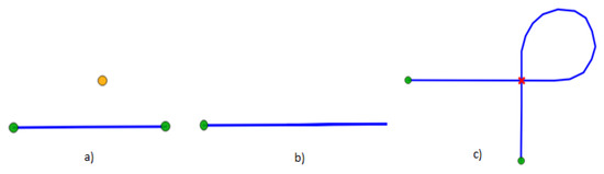 For point features (e.g., valve, flow meter), the following rules should be established [28]: they must be located at the end of the graph’s edge and must intersect one of the points of a linear element’s boundary (e.g., pipe); an entity located at the end of a section must be of a single type and entity duplication is forbidden. Typical errors may consist of, for instance (see Figure 1), orphan nodes, snapping errors (such as under or overshoots), duplicate entities, non-segmentation of linear entities at the intersection point of its interior with the point.
