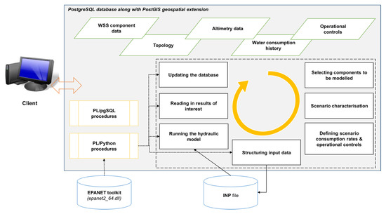 Conceptual model of the system proposed: data stored in the system and functions implemented on the geospatial database management system (DBMS) enable the construction of the hydraulic model (based on EPANET numerical model) and running it (through SQL instructions).