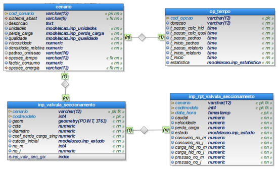 As an illustrative example, let us consider opcoes and cenario relational tables. These relations allow the completion of the characterization of each hydraulic simulation scenario. Each tuple of cenario relation allows the establishment of the simulation ID code, the code of the system to be modelled, the consumption units, continuous head loss equation, and the set of temporal options. The attribute referring to temporal options consists of a foreign key that refers to the primary key in op_tempo relational table (Figure 3 above) enabling the sharing of the set of temporal options tuple, and in turn establishes the entire simulation time window, hydraulic time step, pattern time step, report time step and other similar options.