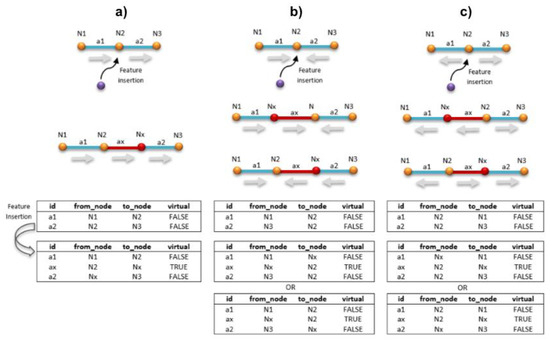 Representation of the arc-node topological model and its update after the insertion in the system of a specified component: (a) same direction of flow at the insertion point; (b) converging flow directions at the insertion point; (c) diverging flow directions at the insertion point.