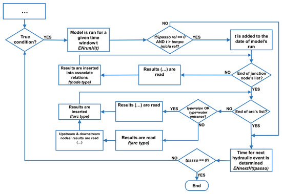 In order to run a specific hydraulic simulation, SQL instructions must be executed using the functions and procedures above plus respective input data, such as hydraulic options, time windows, water consumption values, topological information and heights, or physical characterization of geometric network components. The associated hydraulic model is then either generated from scratch or simply updated based on the data above, and the needed WSS code is specified.