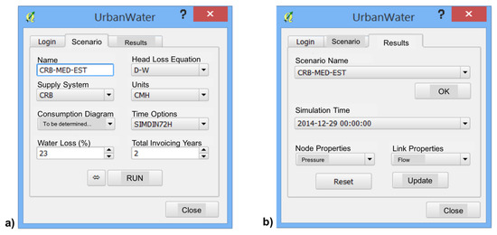 UrbanWater (labels in English are in insert): a Quantum Geographical Information System (QGIS) plug-in developed for hydraulic simulation purposes (a) simulation scenario parameters; (b) simulation results.