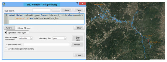 In addition to the quick generation of the INP file, another advantage of storing results in a geospatial DBMS is the possibility of a joint usage of both DBMS and mapping functionalities. Figure 12 exemplifies how the plugin’s database (DB) manager was used in a SQL query to geospatially map all pipes in which velocity is higher than the maximum threshold allowed.