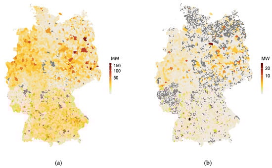 (a) Installed capacity and (b) intra-annual capacity increase of PV systems at LAU2 level in Germany for 2016. In the dark grey areas no PV systems are (a) installed or (b) have been added during this year.