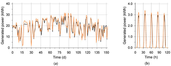 Simulated (black line) and measured (orange line) power generation from a roof-top system with an installed capacity of 4.51 kW (a) over a period of five months with a daily resolution and (b) over the first five days of this period with an hourly resolution.